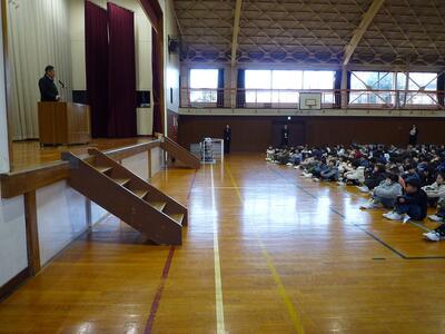 始業式の校長講話では、今年のめあてを意識して生活することや地域の方へのあいさつの大切さについての話がありました。