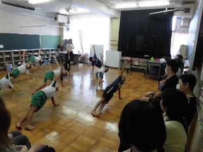 1時間目にひまわり学級の授業参観がありました。ひまわり学級は毎日1時間目に実施しているリトミック、ヨガ、バランスボールの活動を行いました。姿勢を保持したり、体のバランスをとったりする力はとても重要です。始業式から毎日こつこつと取り組んできた成果をしっかりと披露できました。床に足をつかないでバランスボールに30秒間座ることができた児童の姿に、保護者の方から温かい拍手をいただきました。子供たちもとても嬉しそうでした。