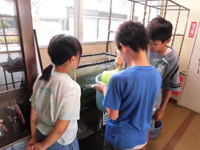 これから暑さが厳しくなり水槽の水温の管理が難しくなることから、夏の間は所沢市埋蔵文化センターに里帰りをします。本日、引き取られていったので、業間休みに、委員会の子供たちが水槽の後片付けに取り組んでいました。次に戻ってくるのは10月の上旬です。