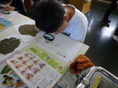6年2組は、理科の授業で校庭の土を「れき」「砂」「どろ」に分ける活動をしていました。大きさによって呼び方が違うことを知り、ピンセットやルーペを使って丁寧に分類していました。