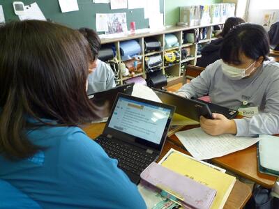 6年1組では英語のグループ発表練習をしていました。好きな果物や野菜、肉などについて、そのものはどこでできたのか、できた国はどのような国なのかなどの文章をタブレットで書き、すらすらと読めるように練習をしていました。アルファベットを使って書くのが苦手だからと英語の発音をそのままカタカナで打ったり、翻訳機能を活用したり、手段は人それぞれのようでしたが、みんなの前で英語で発表するという目的は同じです。自信をもって発表できるよう頑張ってほしいです。