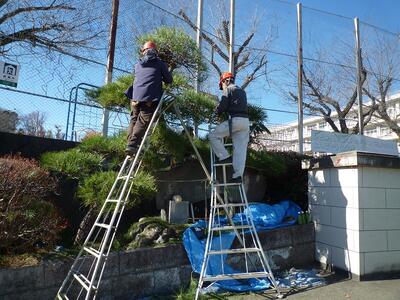 本校の正門の脇に松の木があります。本日、地域の方がその松の木を剪定してくださいました。