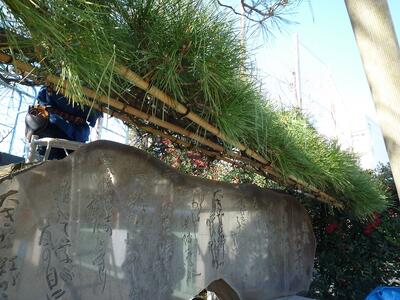 この松の木は昭和57年の学校創立の記念に植樹されたものです。松の木の下には校歌の石碑があります。この石碑の文字は、初代校長の石井先生(校歌の作詞もされています)がお書きになったものとのことでした。とても味わいのある素敵な文字です。剪定してくださった地域の方は、石井先生直筆の色紙をお持ちだそうです。