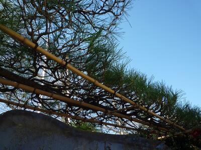 松の木は、枝ぶりの美しさを見てもらうものだからと、毎年秋に剪定をしてくださっているそうです。写真を見ていただければわかる通り、剪定の前と後では枝の見え方が違います。