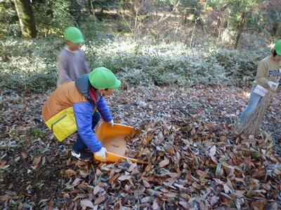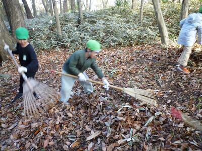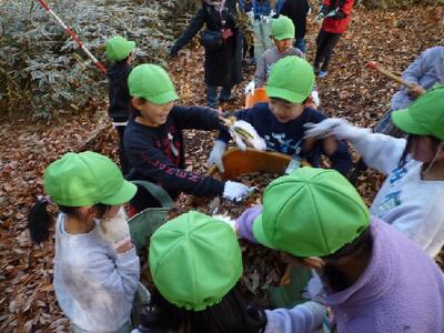 12月16日(火)2年生が隣の「いきものふれあいの里センター」に行き、里山の落ち葉はきをしました。竹ぼうきや熊手を使って、たくさんの落ち葉を集めました。たくさんとれた落ち葉は、肥料にして来年の学校の畑に使います。