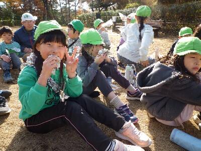 落ち葉はきしている間に、学校の畑で子供たちが収穫したサツマイモを焼き芋にしてくださっていました。暖かい小春日和の中、荒幡富士でみんなでおいしく食べました。