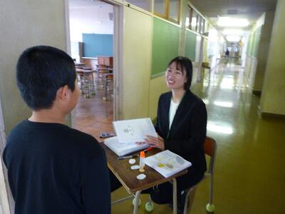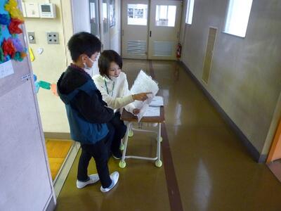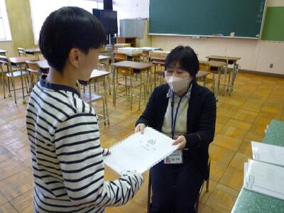 終業式のあとには、2学期の成果である通知表(あゆみ)を渡しました。渡す際に担任が2学期にそれぞれ頑張ったことについて、一人一人に話をして渡している姿が見られました。