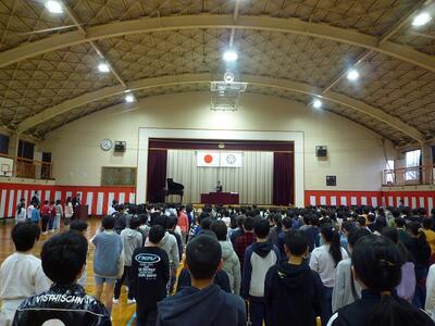 修了式が始まる前に、全員がしっかりと体育館に整列していました。学年最後の日を大切にしたいという思いが行動に表れたのかもしれません。特に来年度最高学年となる5年生は、待つ態度も素晴らしかったです。
