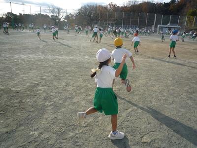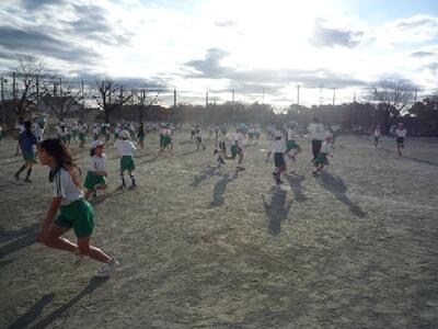 12月9日(火)の体育朝会で全校鬼ごっこをしました。鬼にタッチされると鬼になる「ふえ鬼」という鬼ごっこです。1回戦は1~4年生が鬼で5、6年生を捕まえます。2回戦は3、4年生が鬼でした。3回戦は1、2年生が鬼でした。1、2年生が鬼の時は3,4年生がスキップで、5、6年生はケンケンで逃げるという特別ルールで行いました。鬼になった学年の子がとても張り切って追いかけていました。大盛り上がりの体育朝会でした。