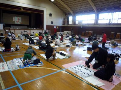 体育館での書初め学習が始まっています。学年のみんなが広い体育館に集まって、真剣に一画一画集中して筆を運ぶ姿が見られました。